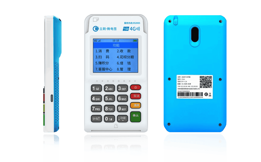 1.  产品形态:机身小巧轻便,配备触摸屏、摄像头(用于扫码)、内置流量卡、支持Wi-Fi连接,并内置热敏打印机,可现场打印签购单。